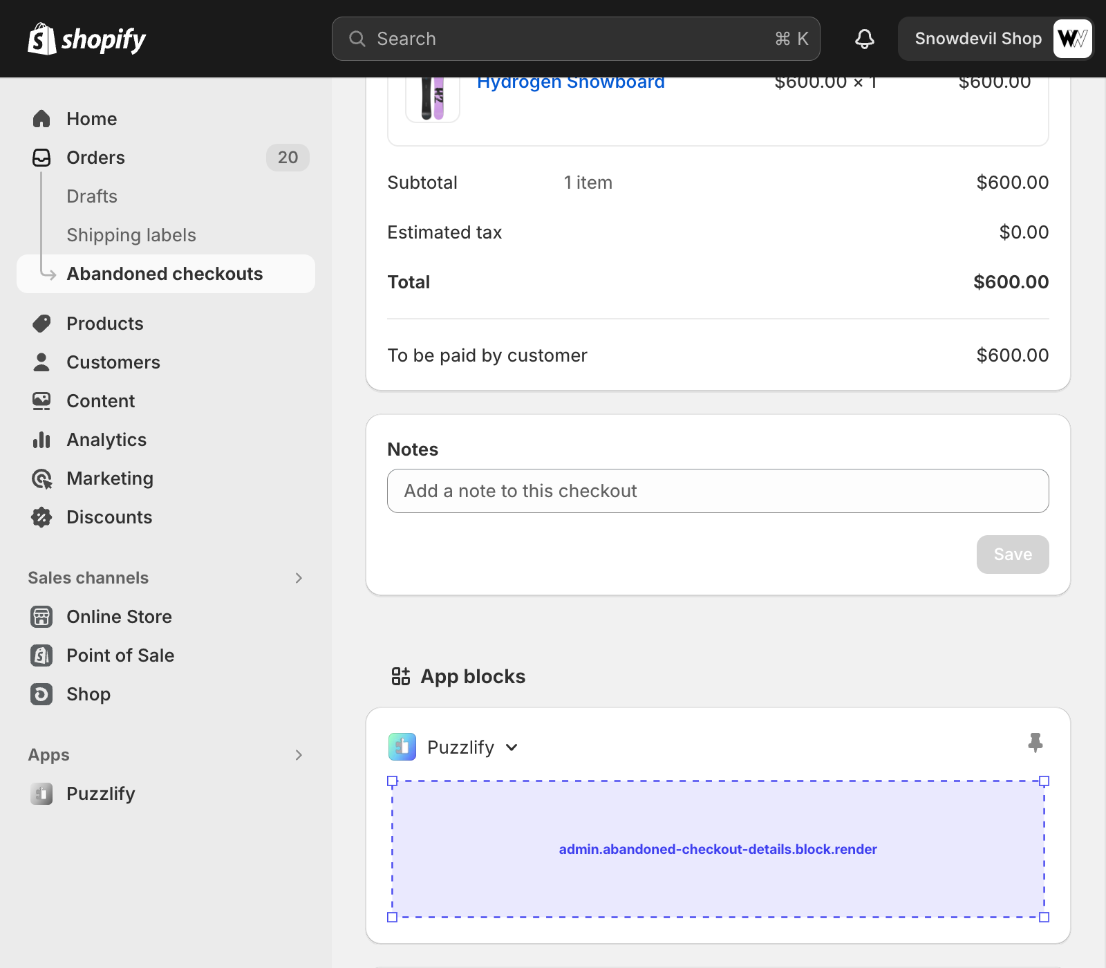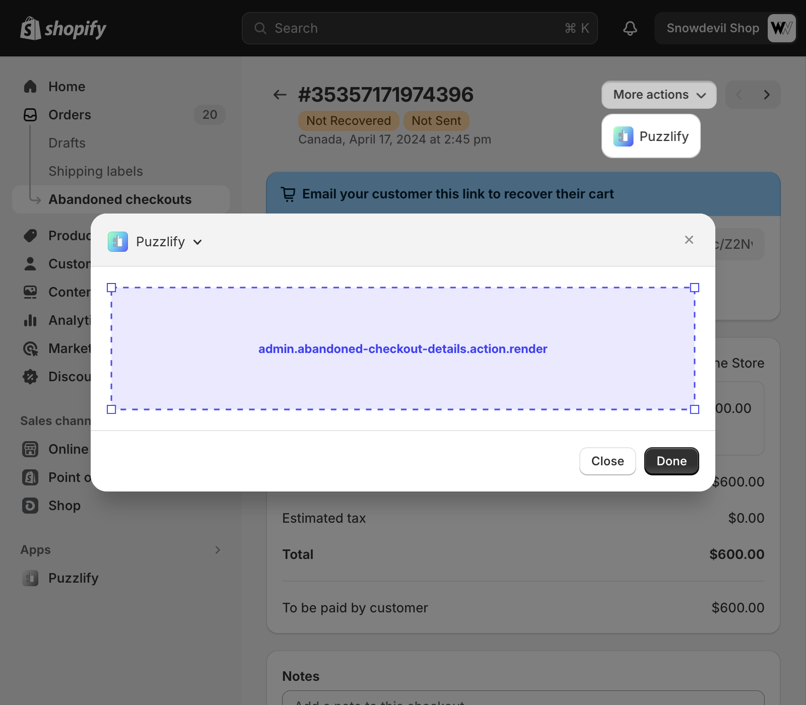 This page shows information about a single abandoned checkout. The admin.abandoned-checkout-details.block.render target is available on this page.