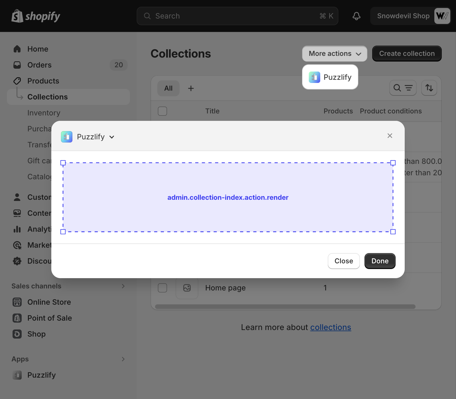 This page shows a table of multiple collections. The admin.collection-index.action.render target is available on this page.