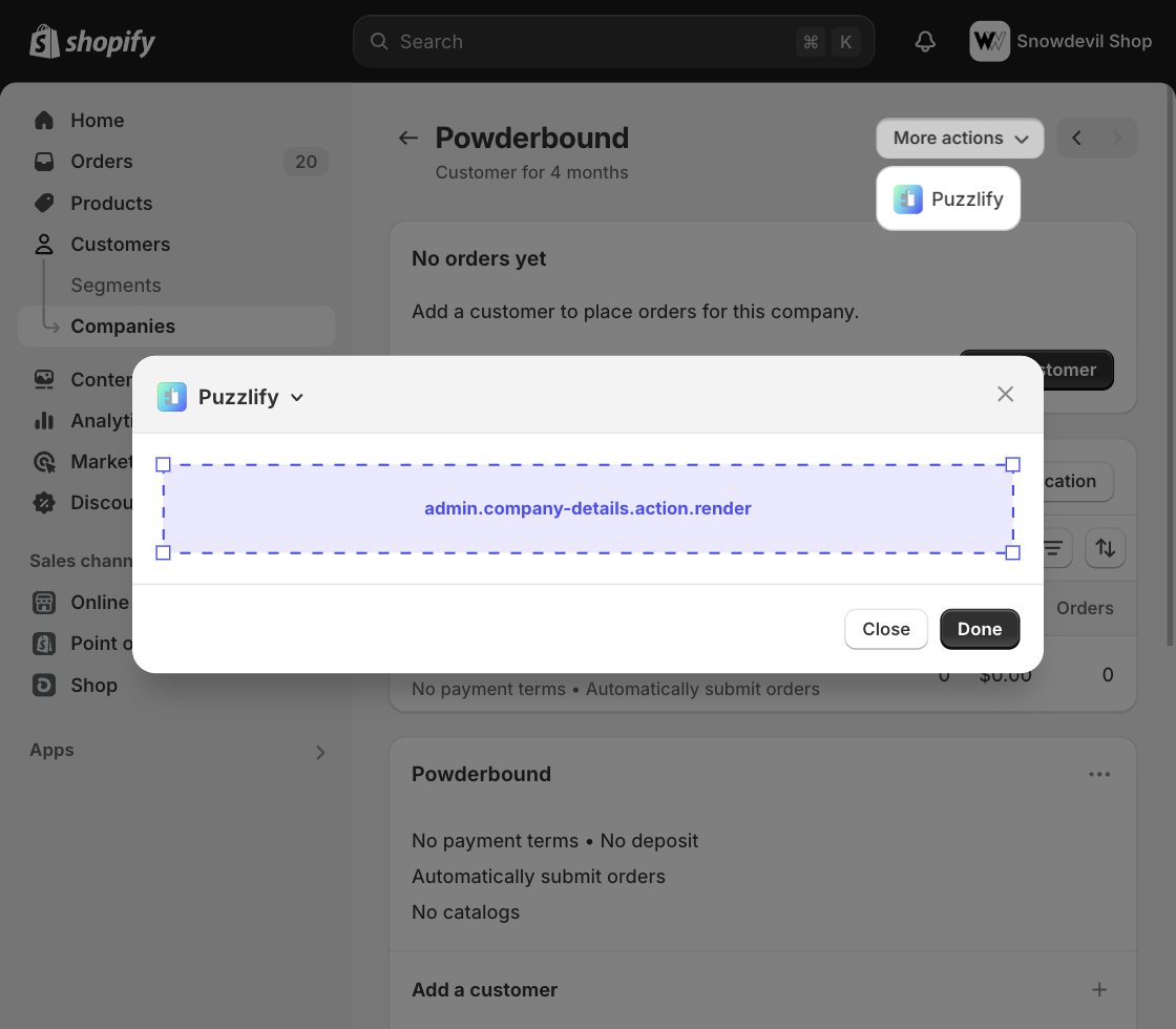Admin action extensions appear on resource pages throughout the admin. Learn more about admin actions.