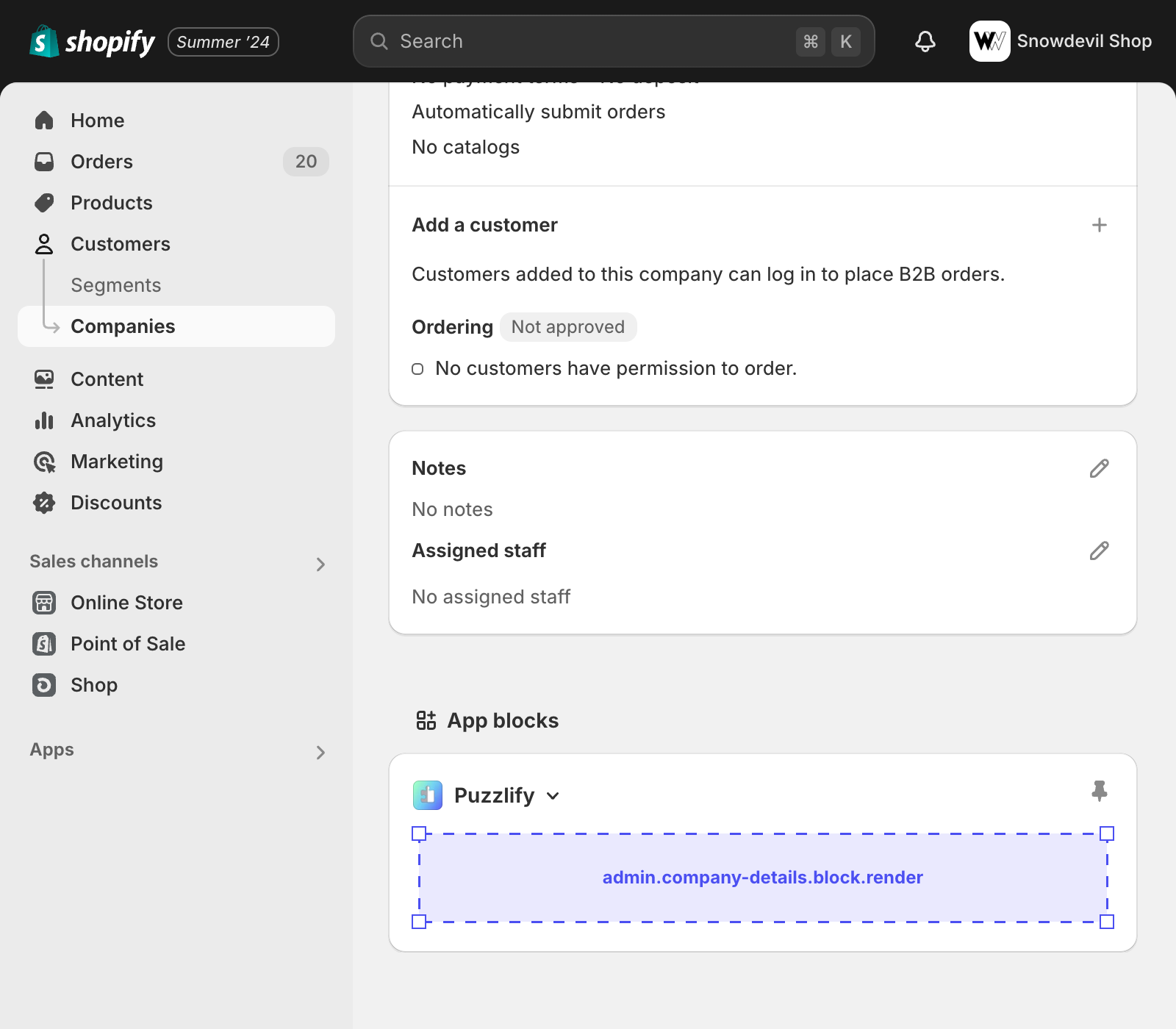 This page shows information about a single company. The admin.company-details.block.render target is available on this page.