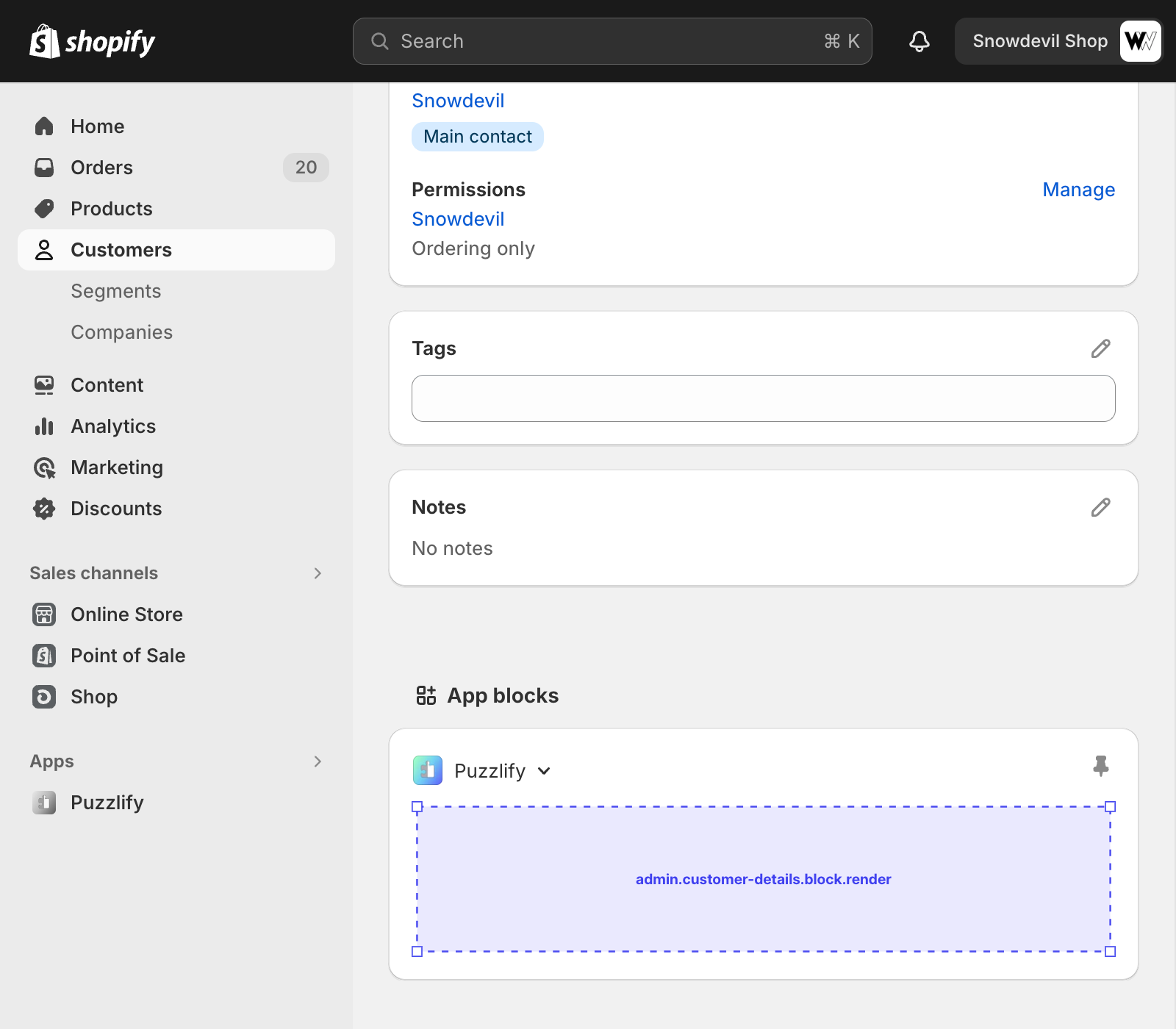 This page shows information about a single customer. The admin.customer-details.block.render target is available on this page.