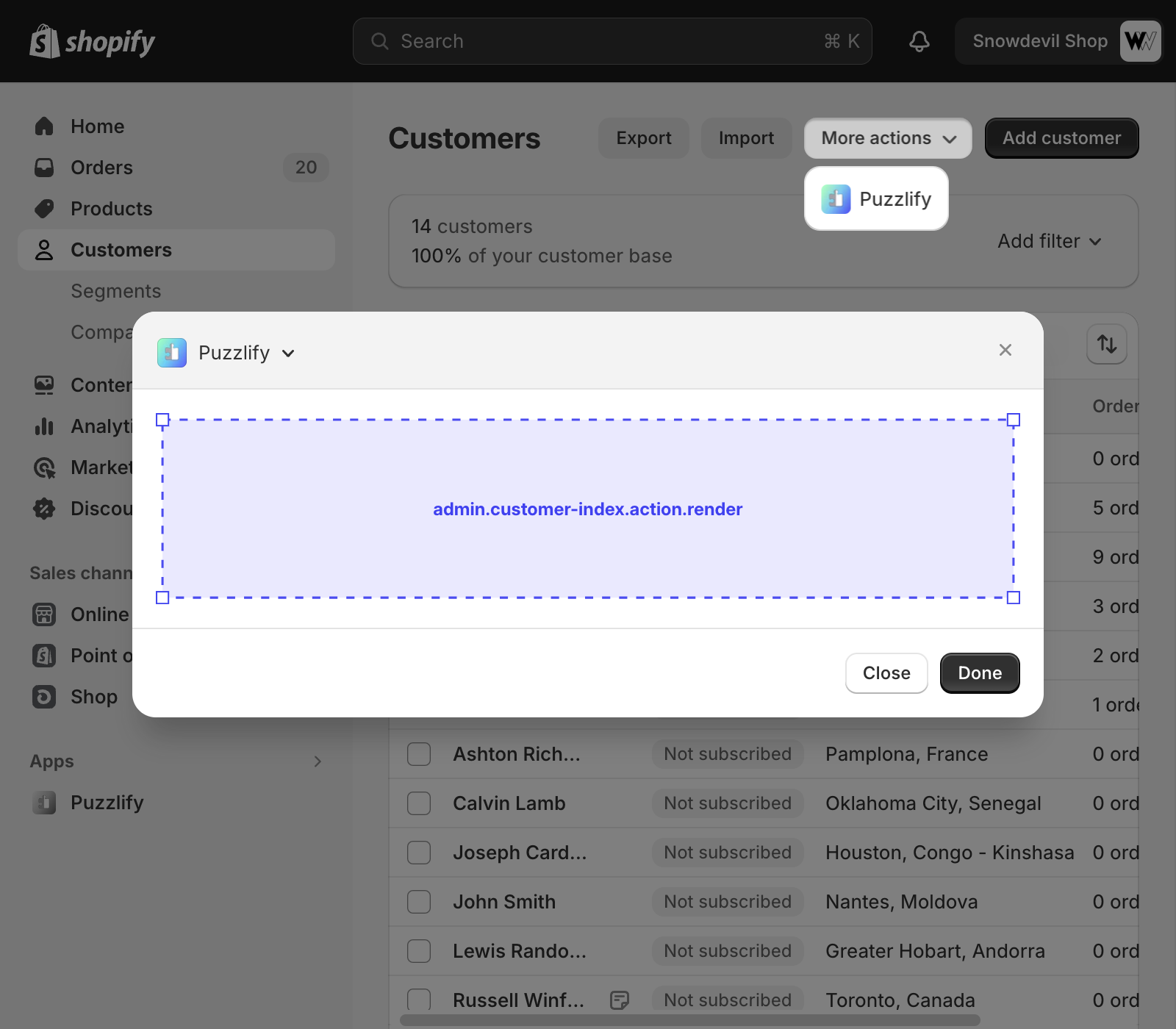 This page shows a table of multiple customers. The admin.customer-index.action.render target is available on this page.