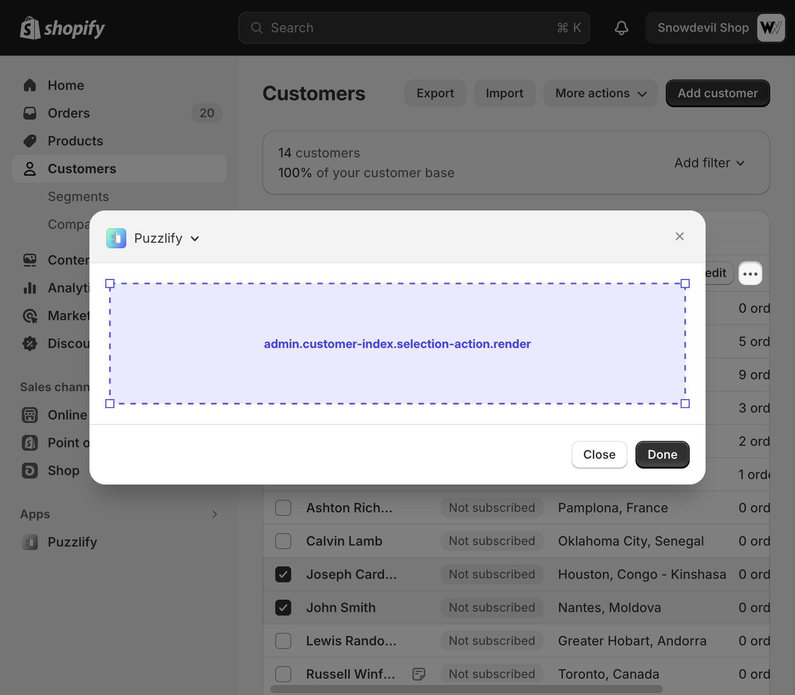 This page shows a table of multiple customers. The admin.customer-index.selection-action.render target is available on this page when multiple customers are selected.