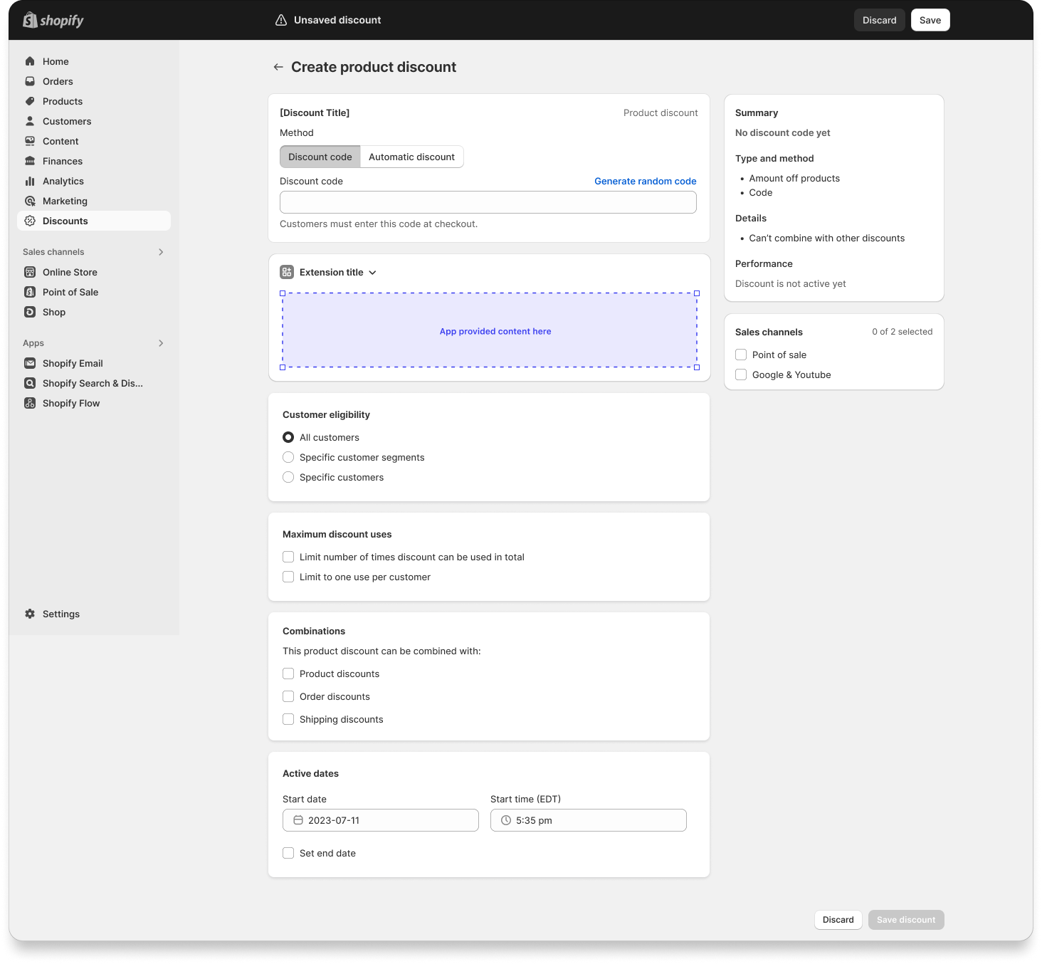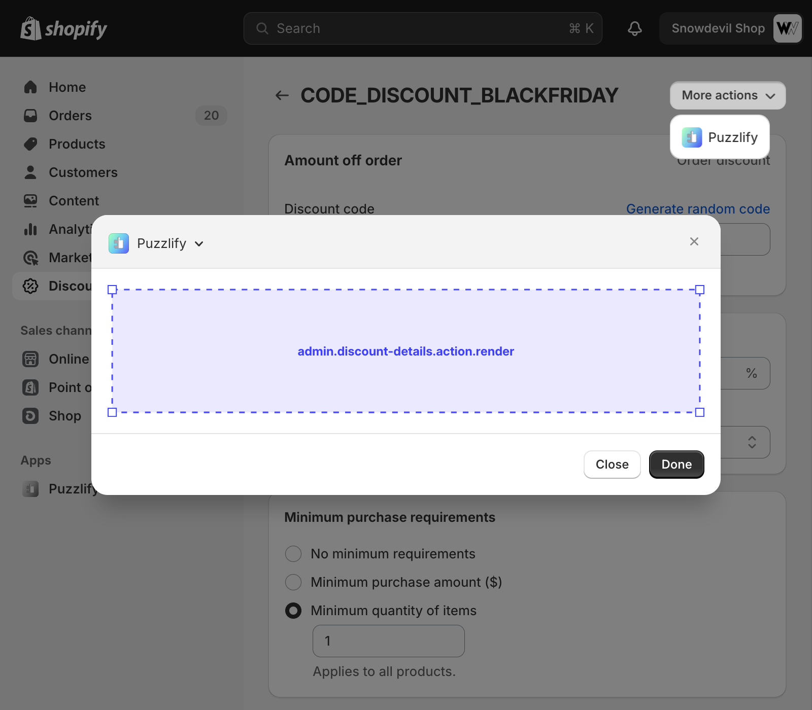 This page shows information about a single discount. The admin.discount-details.action.render target is available on this page.