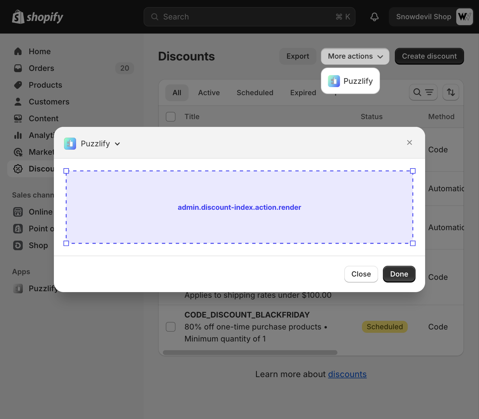 This page shows a table of multiple discounts. The admin.discount-index.action.render target is available on this page.