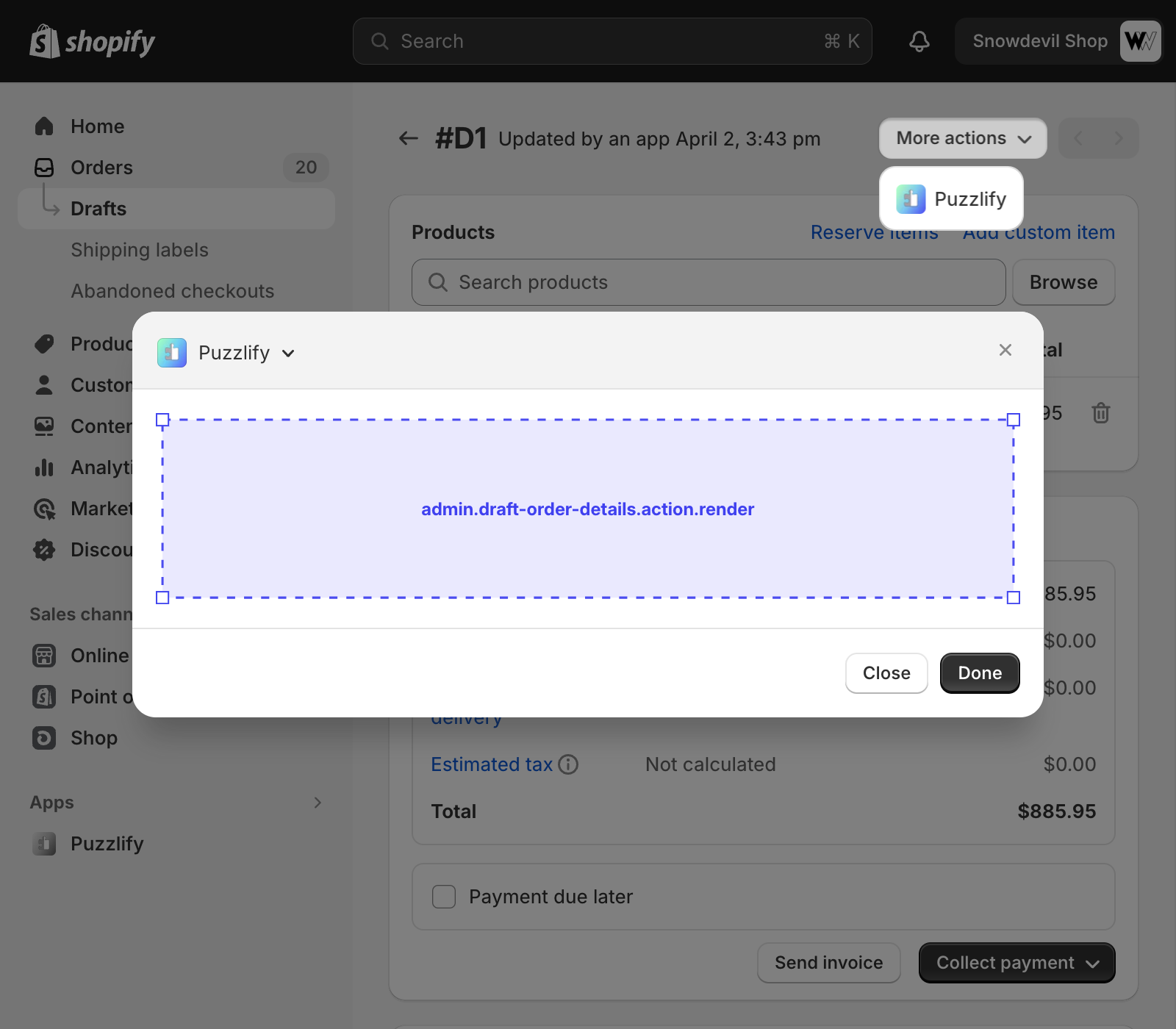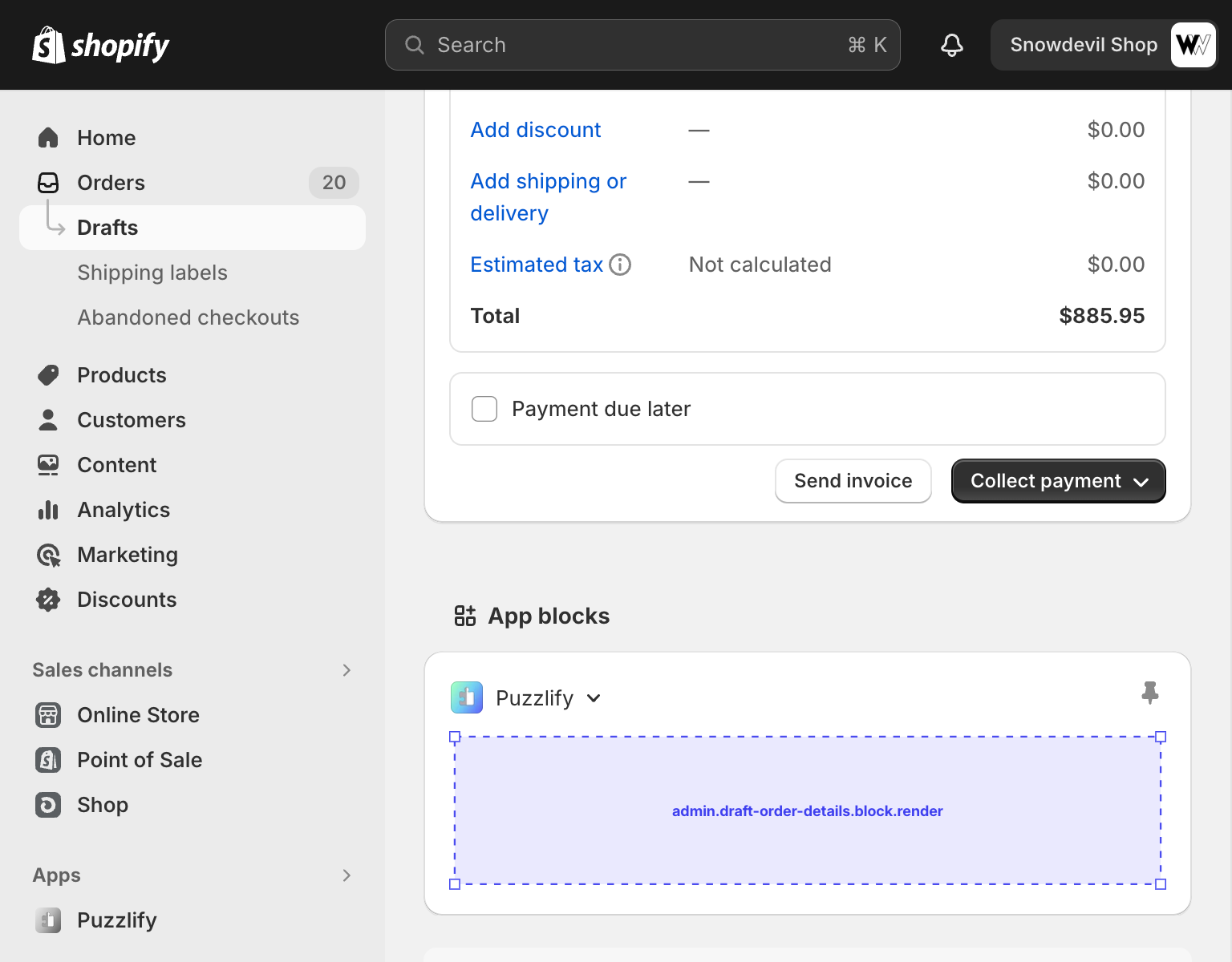 This page shows information about a single draft order. The admin.draft-order-details.block.render target is available on this page.