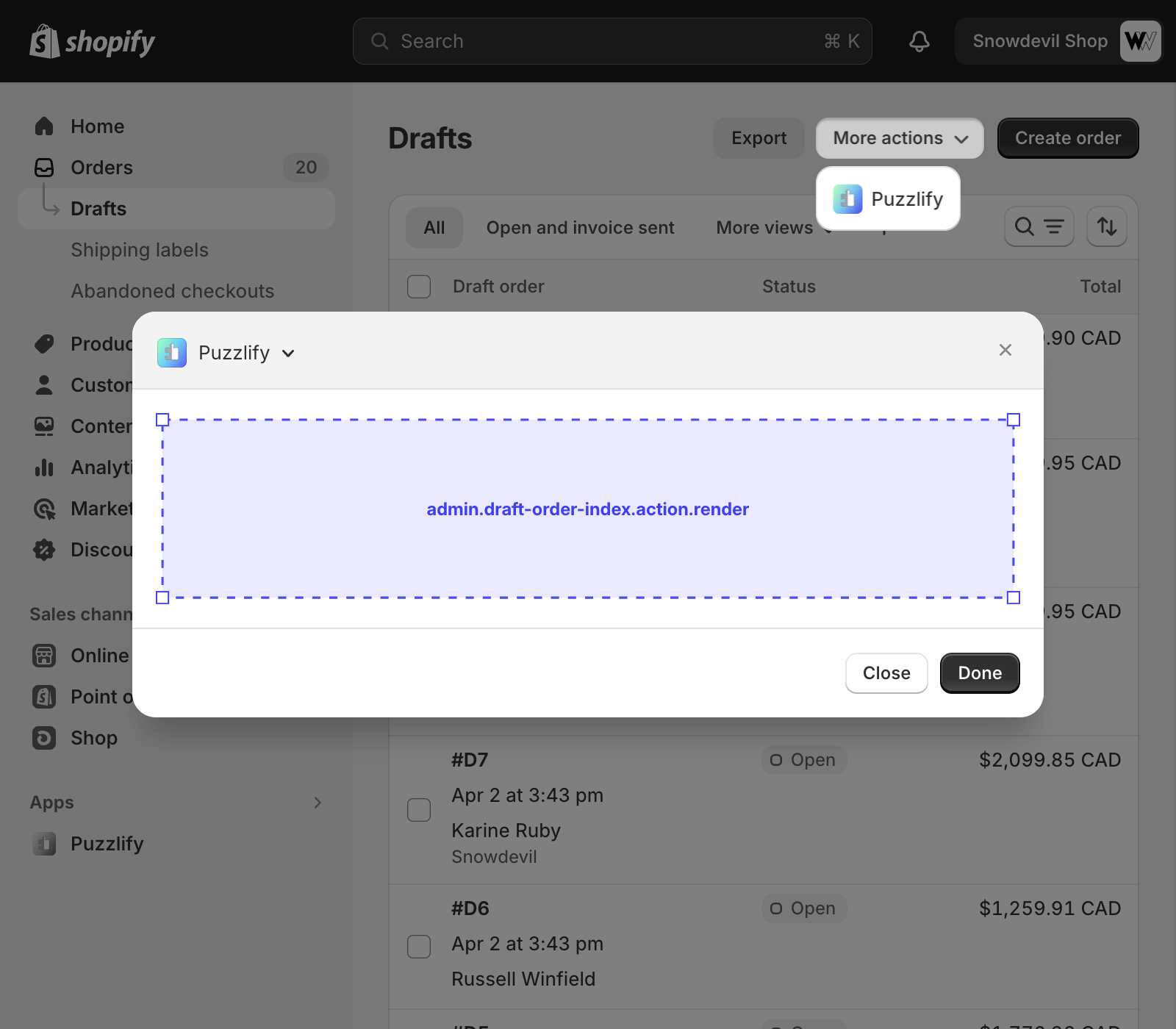 This page shows a table of multiple draft orders. The admin.draft-order-index.action.render target is available on this page.