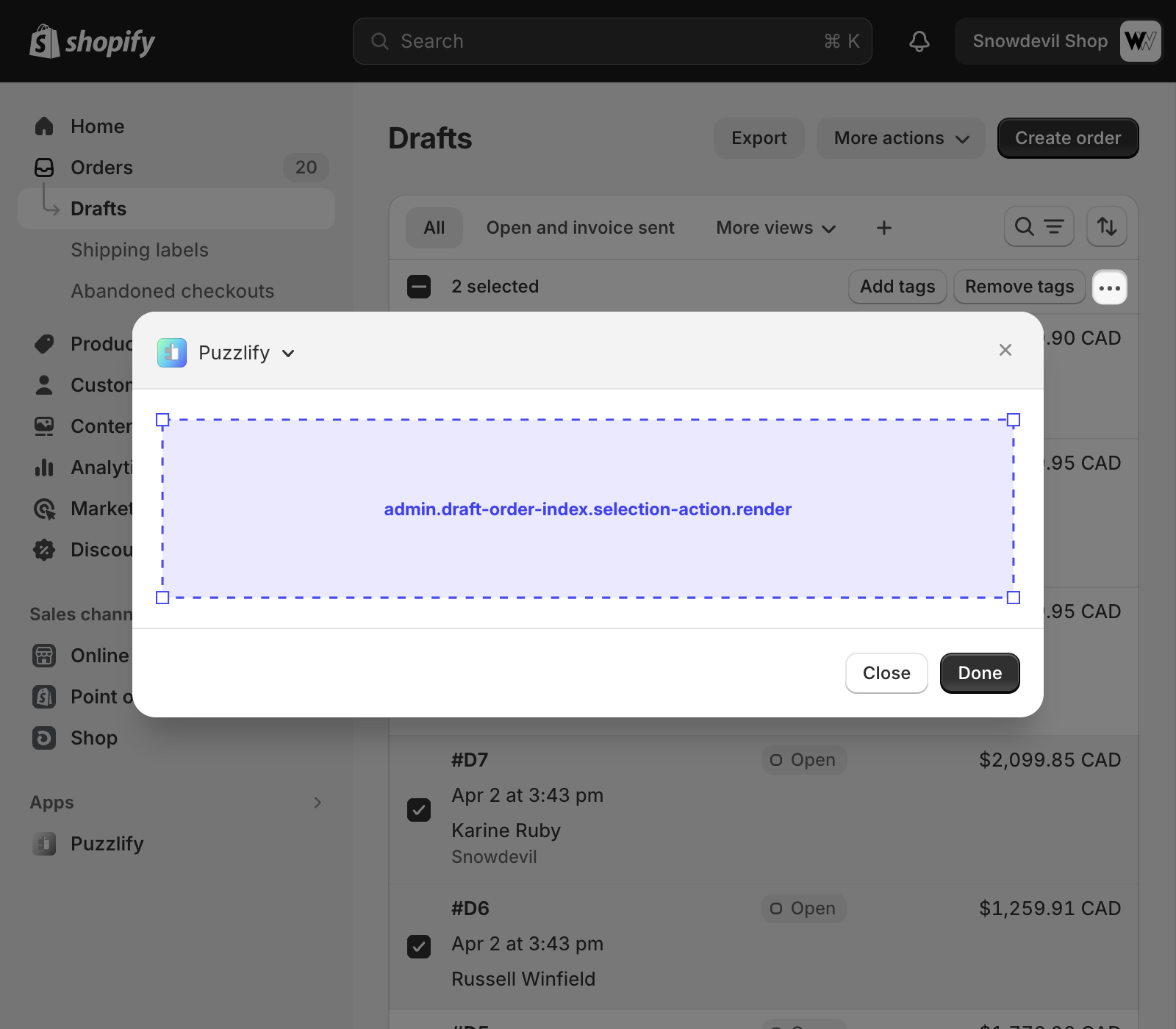This page shows a table of multiple draft orders. The admin.draft-order-index.selection-action.render target is available on this page when multiple draft orders are selected.