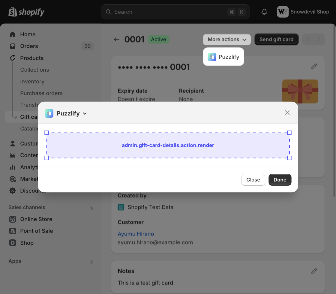 This page shows information about a single gift card. The admin.gift-card-details.action.render target is available on this page.