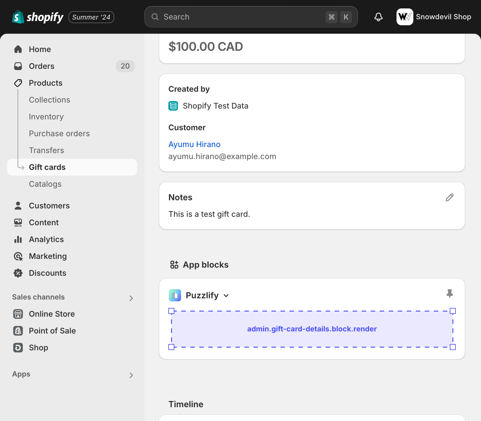This page shows information about a single gift card. The admin.gift-card-details.block.render target is available on this page.