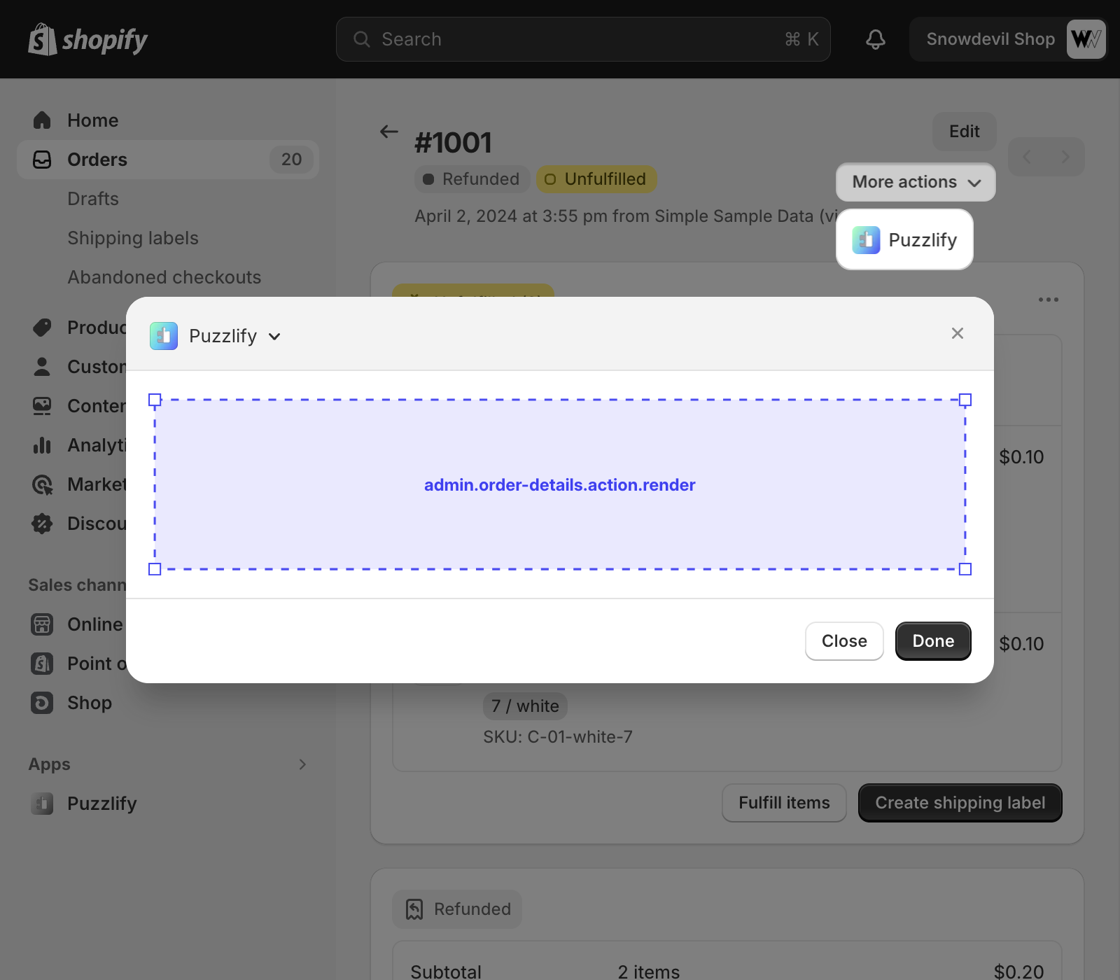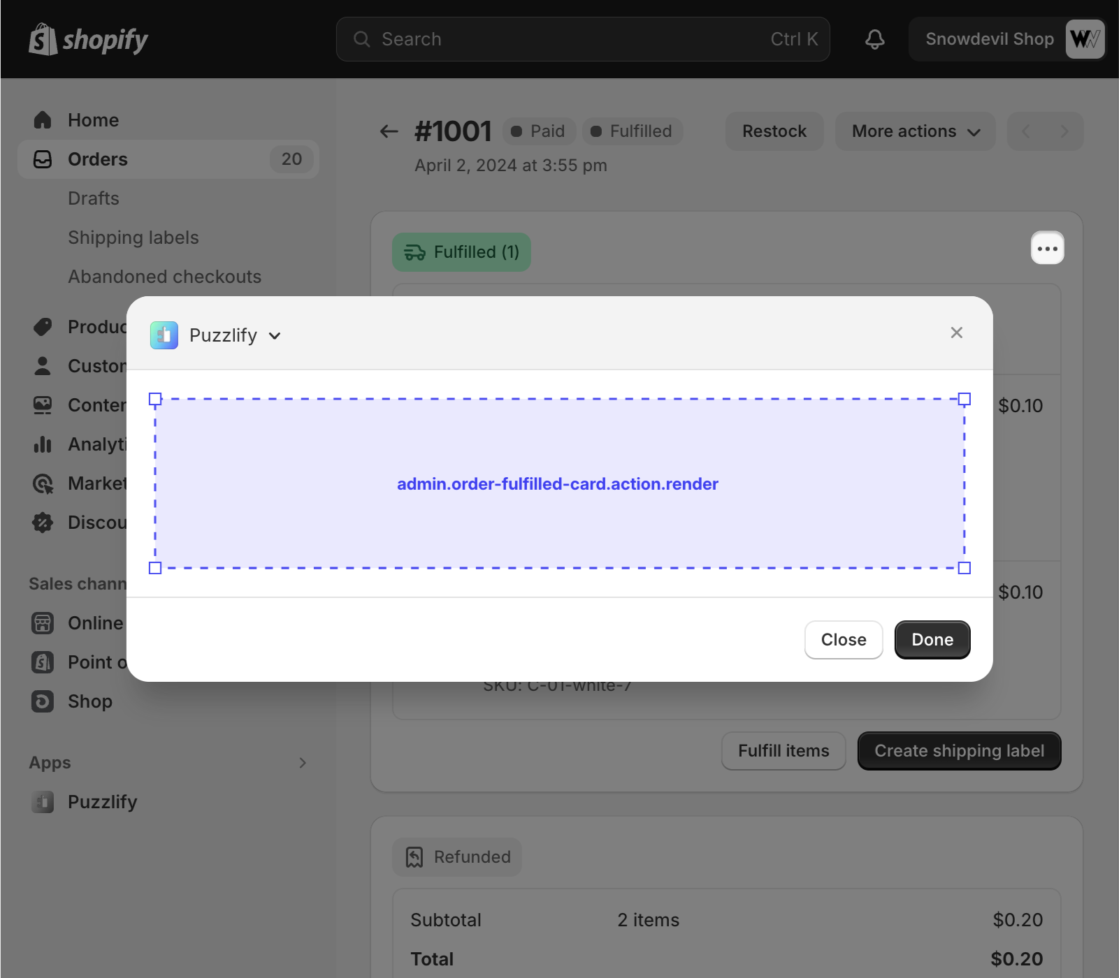 This page shows information about a single order, including a card showing the fulfillment details. The admin.order-fulfilled-card.action.render target is available on this page, but only if your app is selected as the fulfillment app for that order.