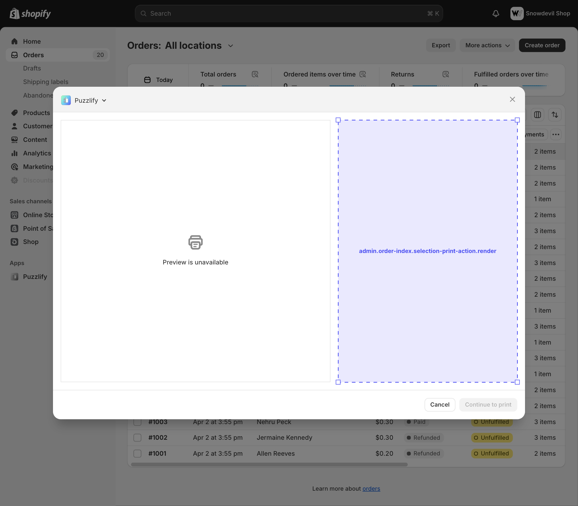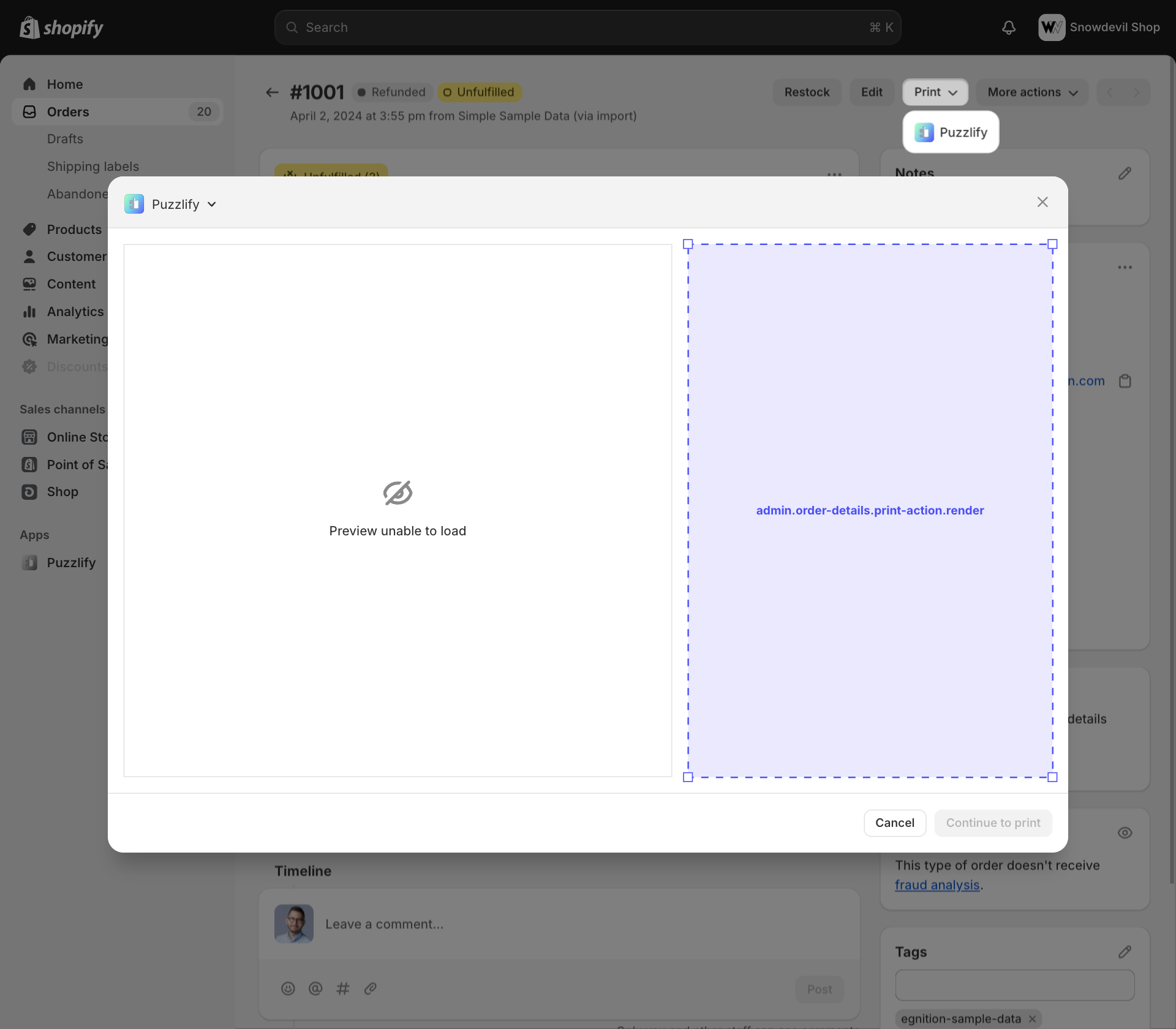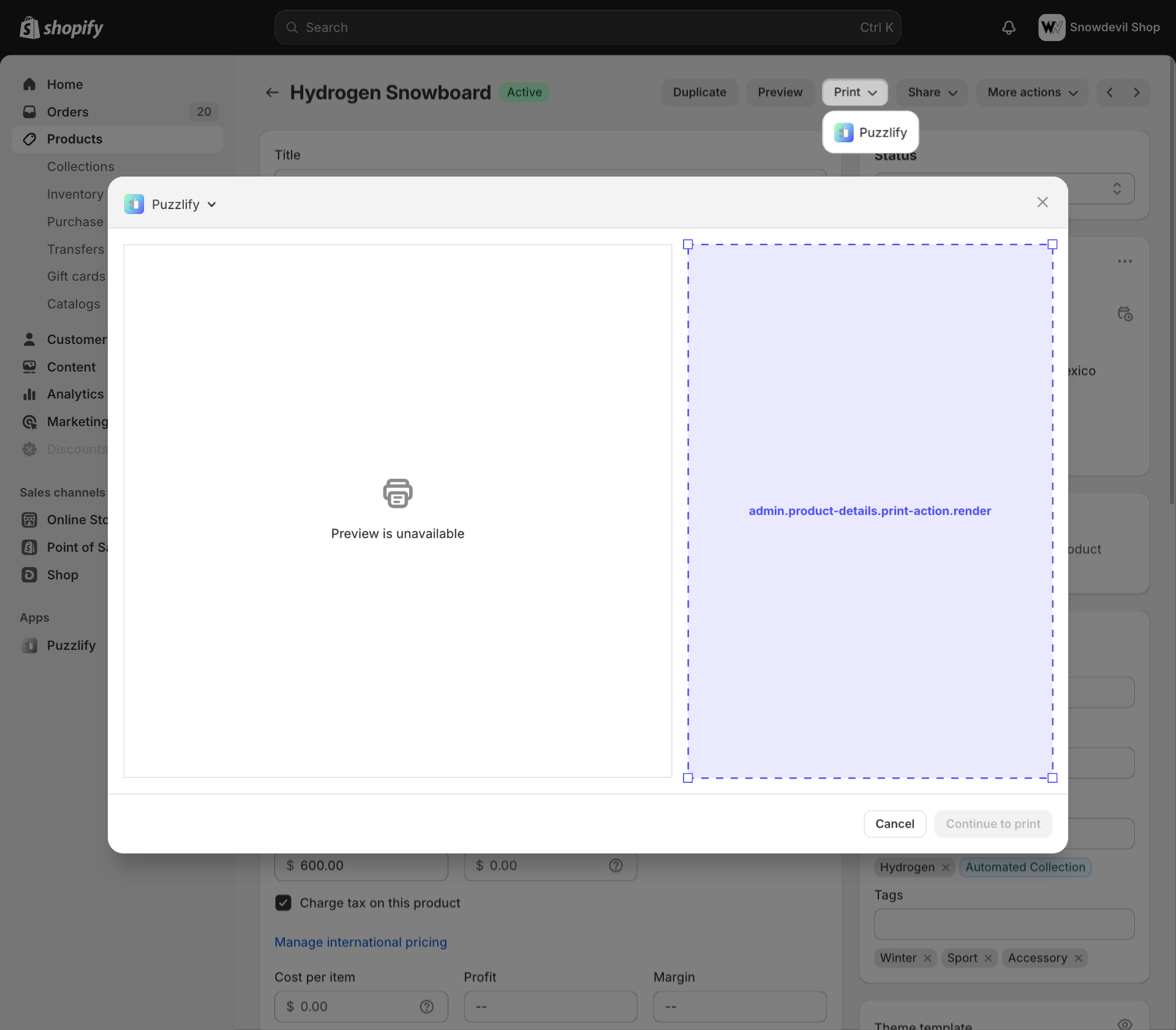 Admin print action extensions appear on order and product pages in the admin.