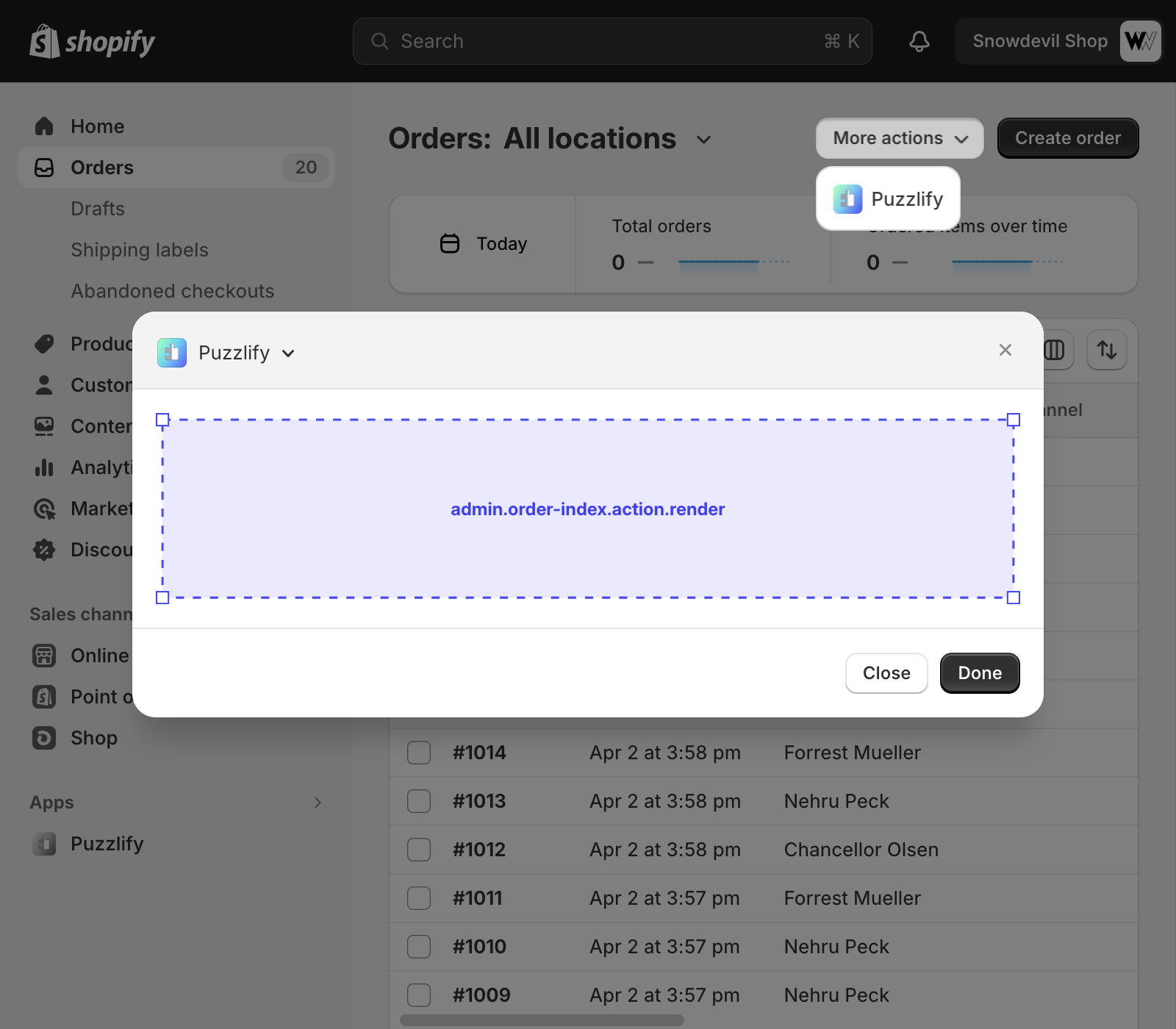 This page shows a table of multiple orders. The admin.order-index.action.render target is available on this page.