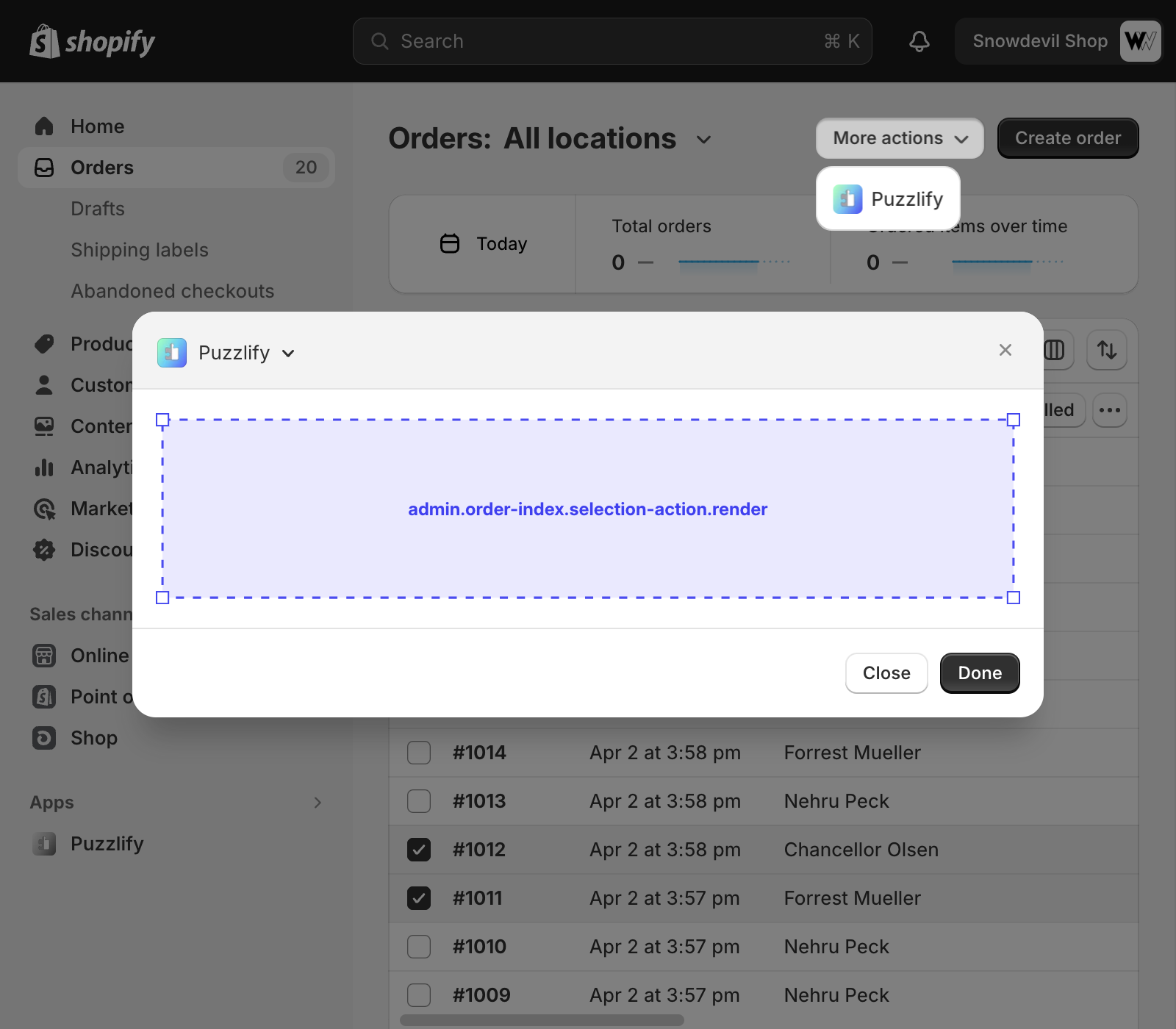 This page shows a table of multiple orders. The admin.order-index.selection-action.render target is available on this page when multiple orders are selected.