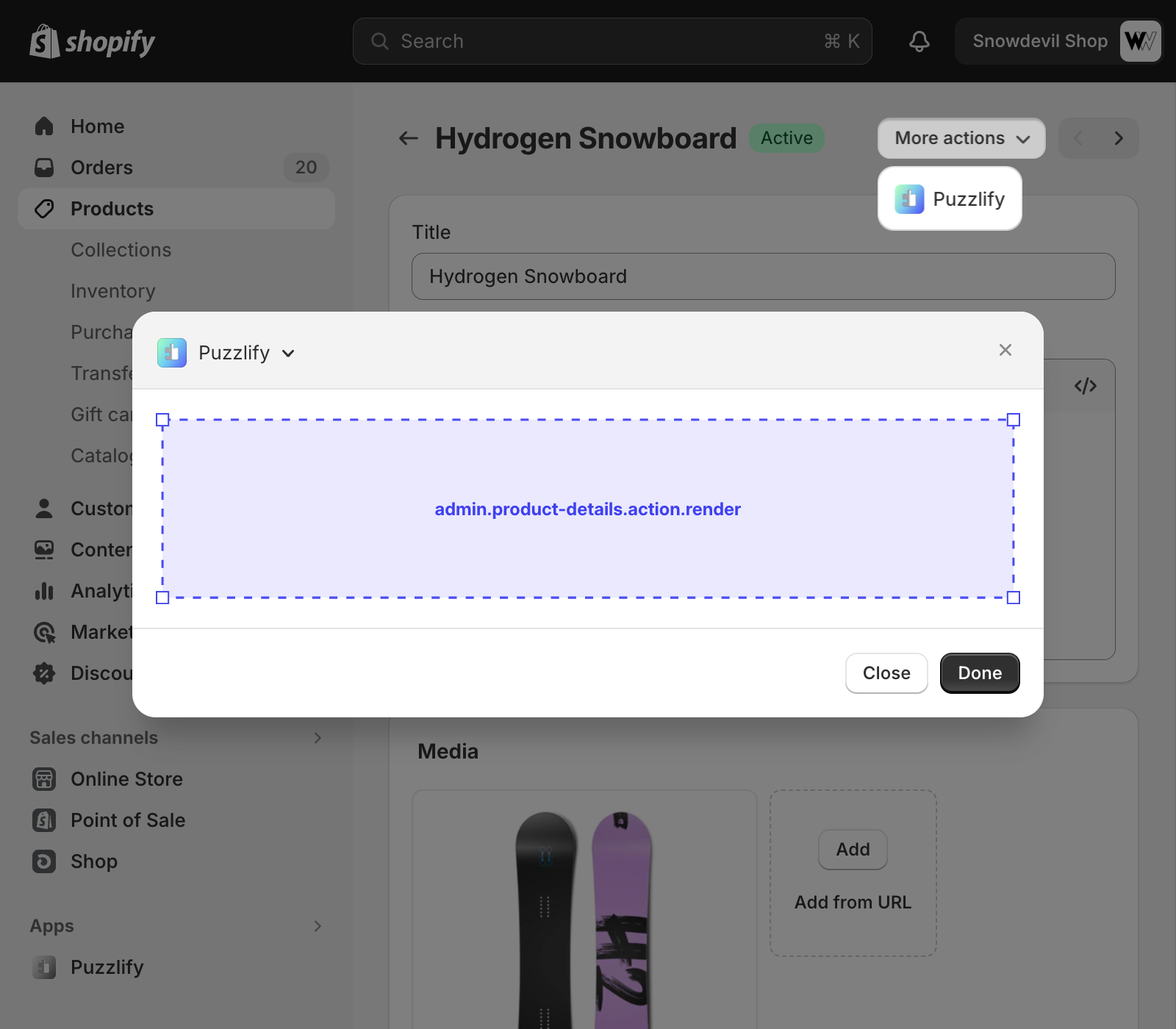 This page shows information about a single product. The admin.product-details.action.render target is available on this page.