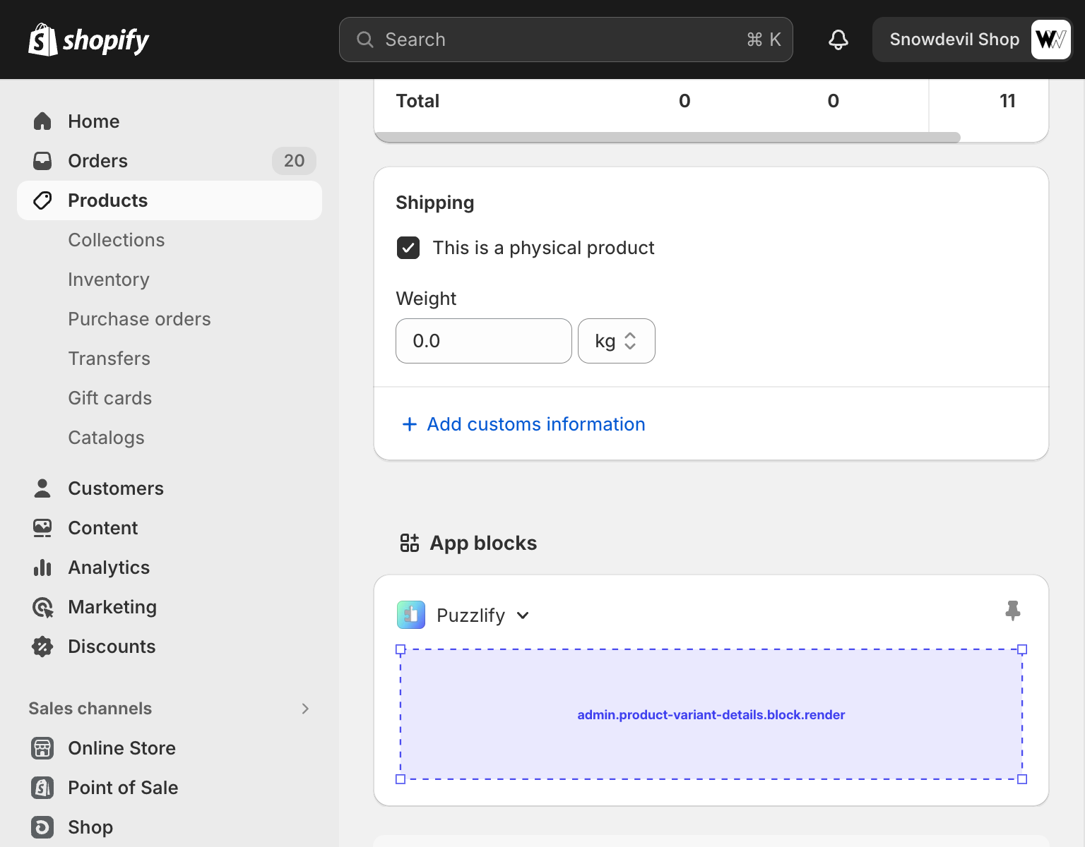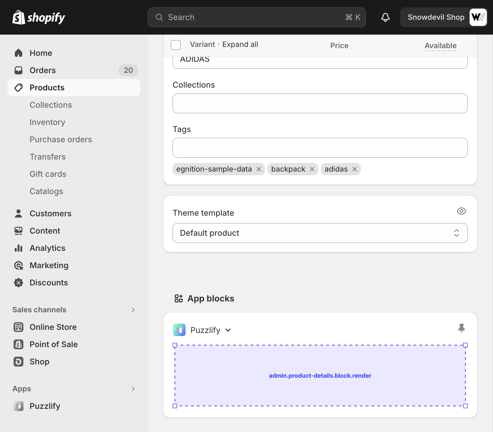 This page shows information about a single product variant. The admin.product-variant-details.block.render target is available on this page.