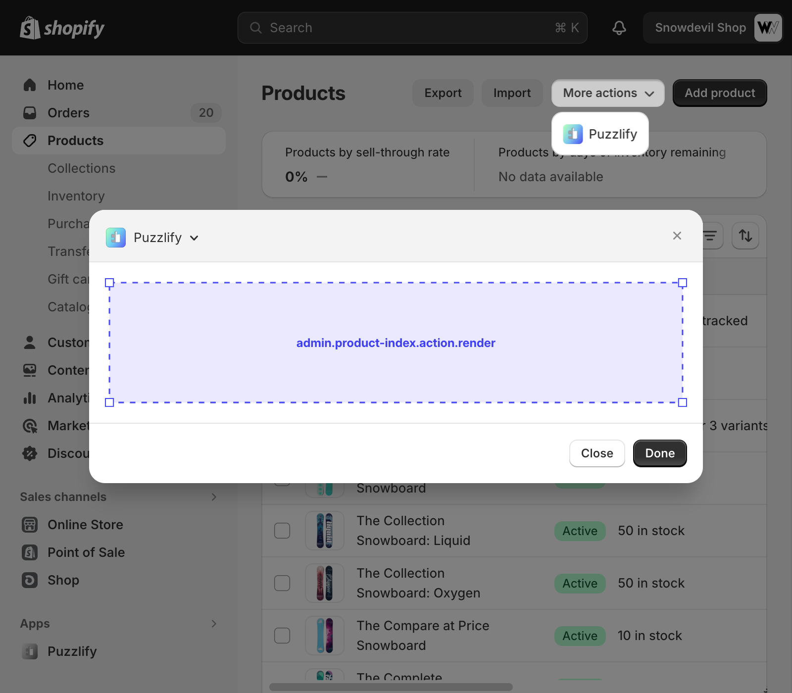 This page shows a table of multiple products. The admin.product-index.action.render target is available on this page.