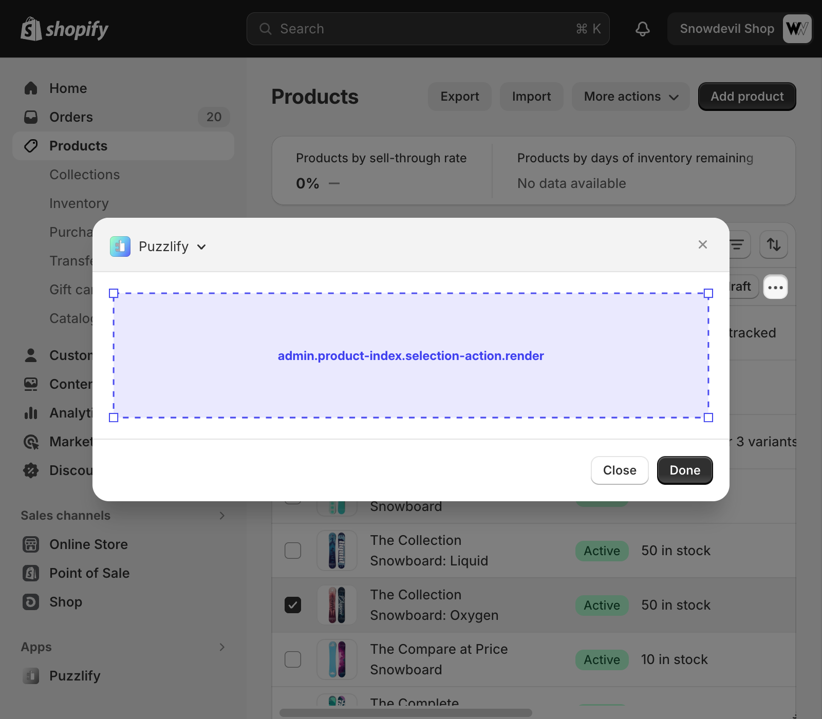 This page shows a table of multiple products. The admin.product-index.selection-action.render target is available on this page when multiple products are selected.