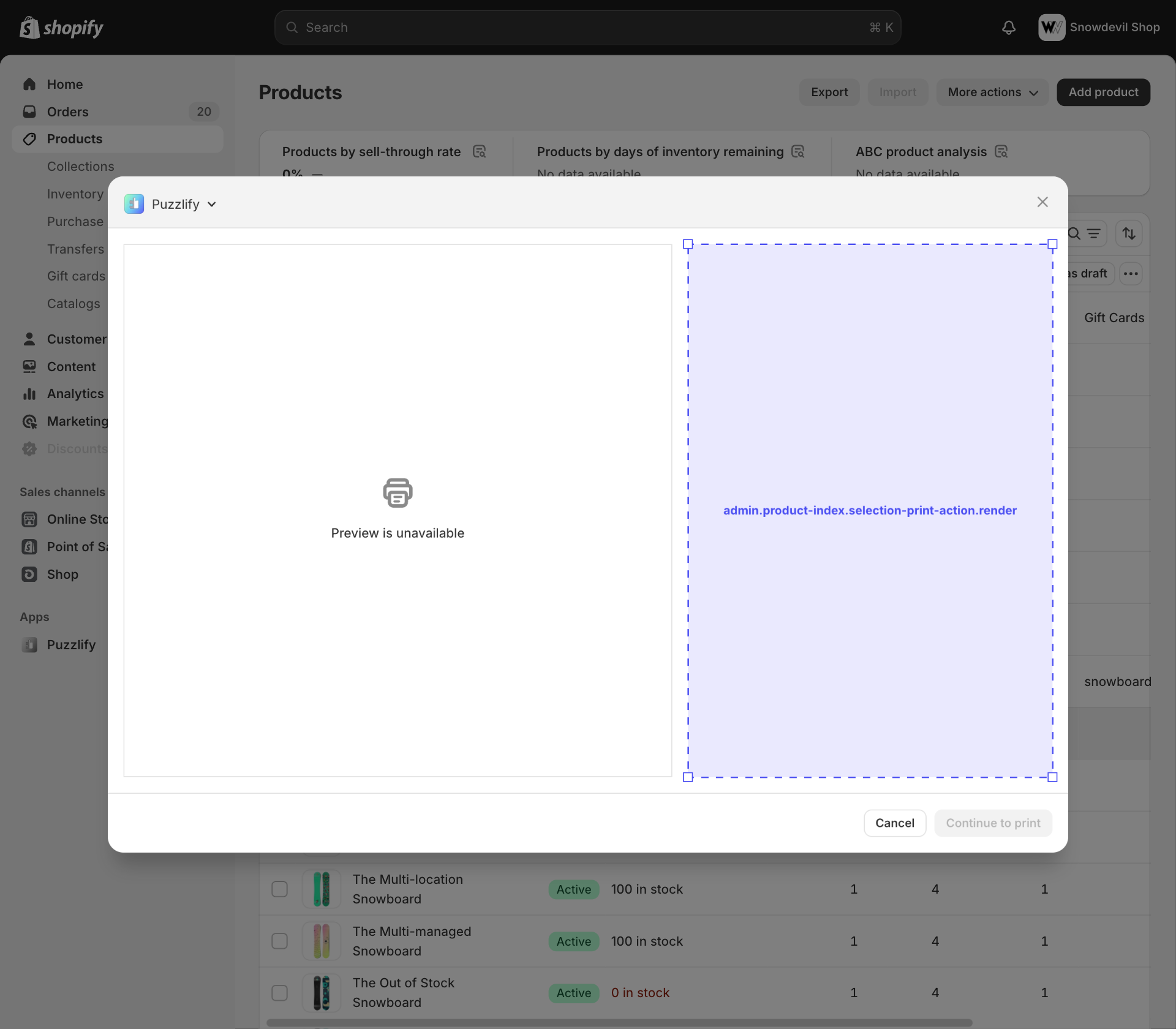 This page shows a table of multiple products. The admin.product-index.selection-print-action.render target is available on this page when multiple products are selected.