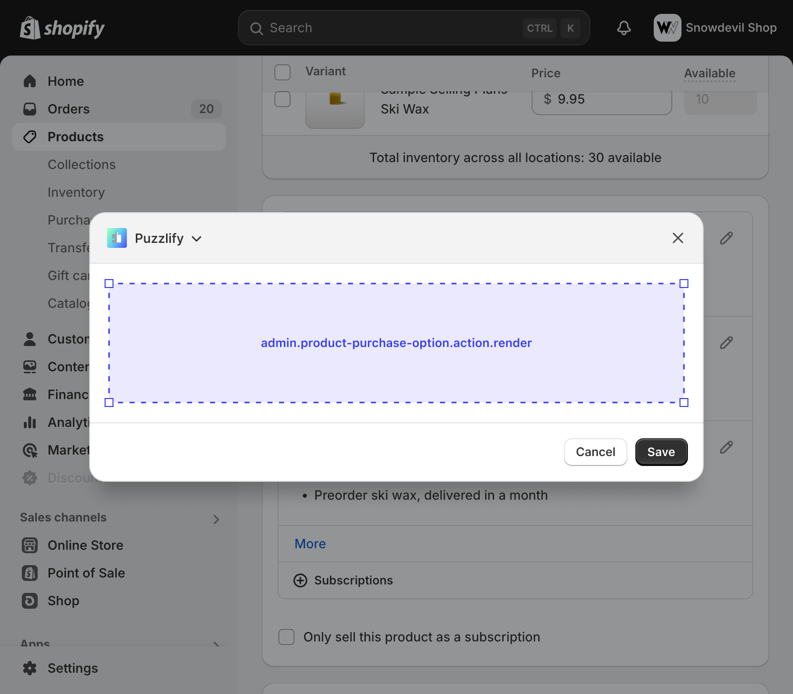 This page shows information about a single product variant, including a card showing purchase options. The admin.product-variant-purchase-option.action.render target is available on this page when selling plans exists.