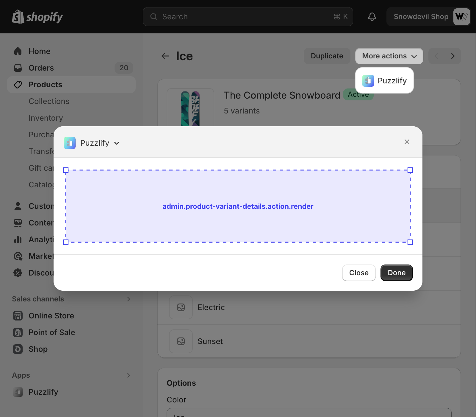 This page shows information about a single product variant. The admin.product-variant-details.configuration.render target is available on this page.