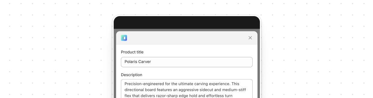 <s-app-window src="/app-window-content.html"></s-app-window> // app-window-content.html <s-page heading="App Window Title"> <s-button slot="primary-action" onclick="shopify.toast.show('Save')">Save</s-button> <s-button slot="secondary-actions" onclick="shopify.toast.show('Close')">Close</s-button> </s-page>