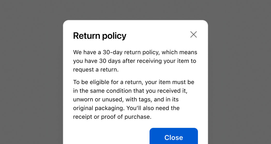 <s-button command="--show" commandfor="modal-1">Add Product</s-button> <s-modal id="modal-1" heading="Return Policy"> <s-paragraph> We have a 30-day return policy, which means you have 30 days after receiving your item to request a return. </s-paragraph> <s-paragraph> To be eligible for a return, your item must be in the same condition that you received it, unworn or unused, with tags, and in its original packaging. You’ll also need the receipt or proof of purchase. </s-paragraph> <s-button variant="primary" command="--hide" commandfor="modal-1" slot="primary-action" > Close </s-button> </s-modal>