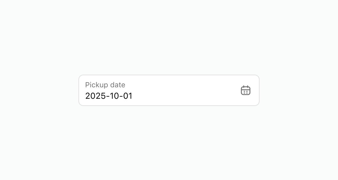 <s-date-field label="Pickup date" defaultValue="2025-10-01"></s-date-field>