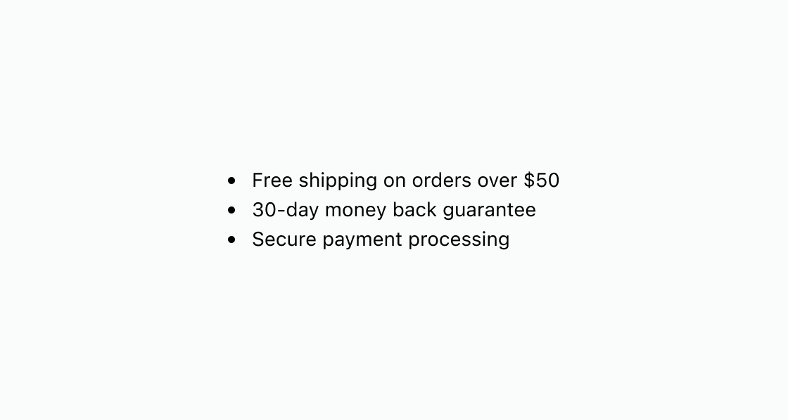 <s-unordered-list> <s-list-item>Free shipping on orders over $50</s-list-item> <s-list-item>30-day money-back guarantee</s-list-item> <s-list-item>Secure payment processing</s-list-item> </s-unordered-list>