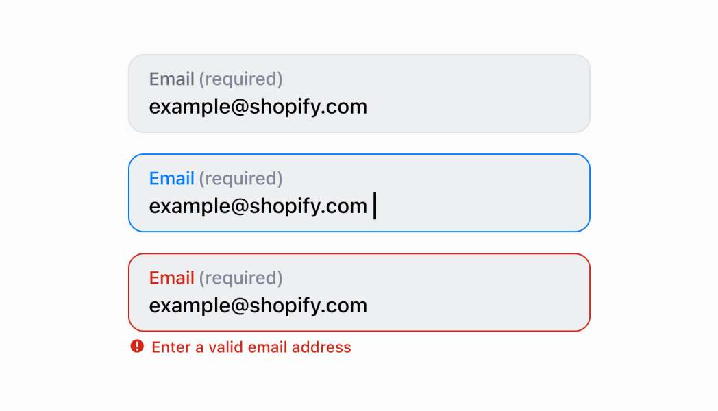 * **Provide helpful guidance with placeholder and helpText:** Use placeholder text for format examples like `customer@example.com` and the `helpText` property for additional context like "Required for digital receipts" or "We'll send order updates to this address."