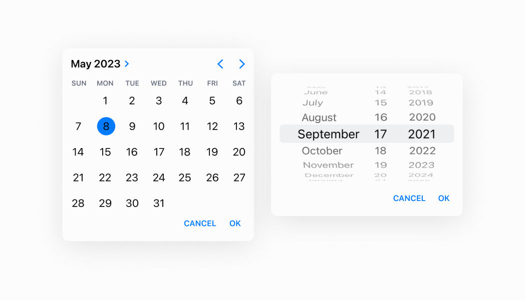 * **Default to current date thoughtfully:** The picker defaults to the current date when no `selected` value is provided. If you need a different starting date or want to guide users to a specific time period, explicitly set the `selected` property.