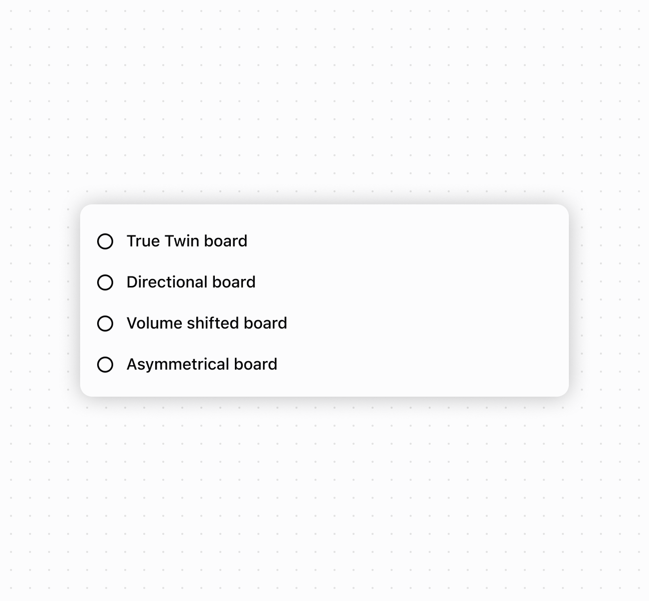 <s-scroll-box> <s-choice-list> <s-choice value="true-twin">True Twin board</s-choice> <s-choice value="directional">Directional board</s-choice> <s-choice value="volume">Volume shifted board</s-choice> <s-choice value="asymmetrical">Asymmetrical board</s-choice> </s-choice-list> </s-scroll-box>